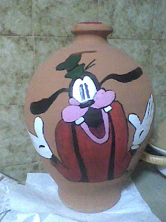 Εκεί που καθόμουν και είχα δίπλα μου τους δύο πήλινους κουμπαράδες που μου είχε αναθέσει ο κουμπάρος μου να του βρω...πήρα ένα πινέλο και κάτι τέμπερες που είχα πρόχειρες και ζωγράφισα τον Γκούφη στον ένα κουμπαρά, μαζί με τα αρχικά του κουμπάρου. Δεν ήμουν σίγουρη αν θα του άρεσε, αλλά είπα να του κάνω πλάκα..."κουμπάρε...δε βρήκα και τους δύο σκέτους, σου πήρα και τον Γκούφη και κοίτα να δεις ε;;...έχει τα αρχικά σου επάνω!!" "άντε ρε θηρίο...πού τον πέτυχες;; Ωραίος είναι..."....φυσικά δεν πίστευε πως μπορεί να τον είχα κάνει εγώ...μου άφησε και τον δεύτερο για να του κάνω τον Οβελίξ ...του έκανα και τον Αστερίξ στην πίσω πλευρά......